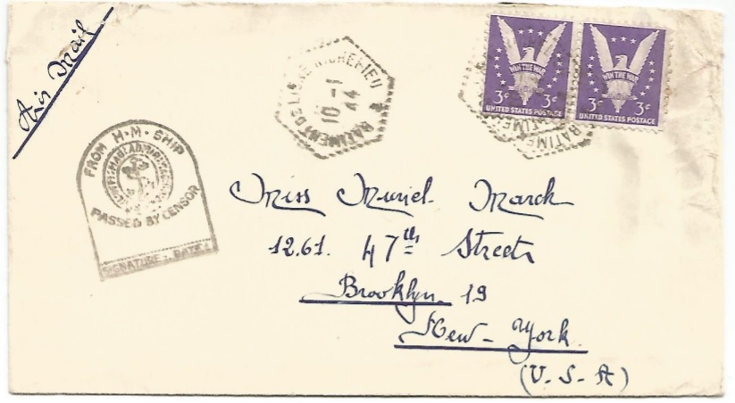 La lettre est affranchie avec des timbres américains parce que la livre sterling valait à cette époque 176 FRF (taux garanti pendant toute la guerre) soit 6d = 4F40. En passant par la poste US les marins français bénéficiaient pour les USA et le Canada de la franchise partielle soit 6¢ au lieu de 8¢. Le dollar en 1943/44 valait entre 43 et 50 FRF soit 6¢ = 3F. Lorsque c’était possible, il était plus avantageux pour les marins français de passer par la poste US. Au verso, il reste des traces de la bande de censure qui était apposé après lecture pour refermer l’enveloppe.