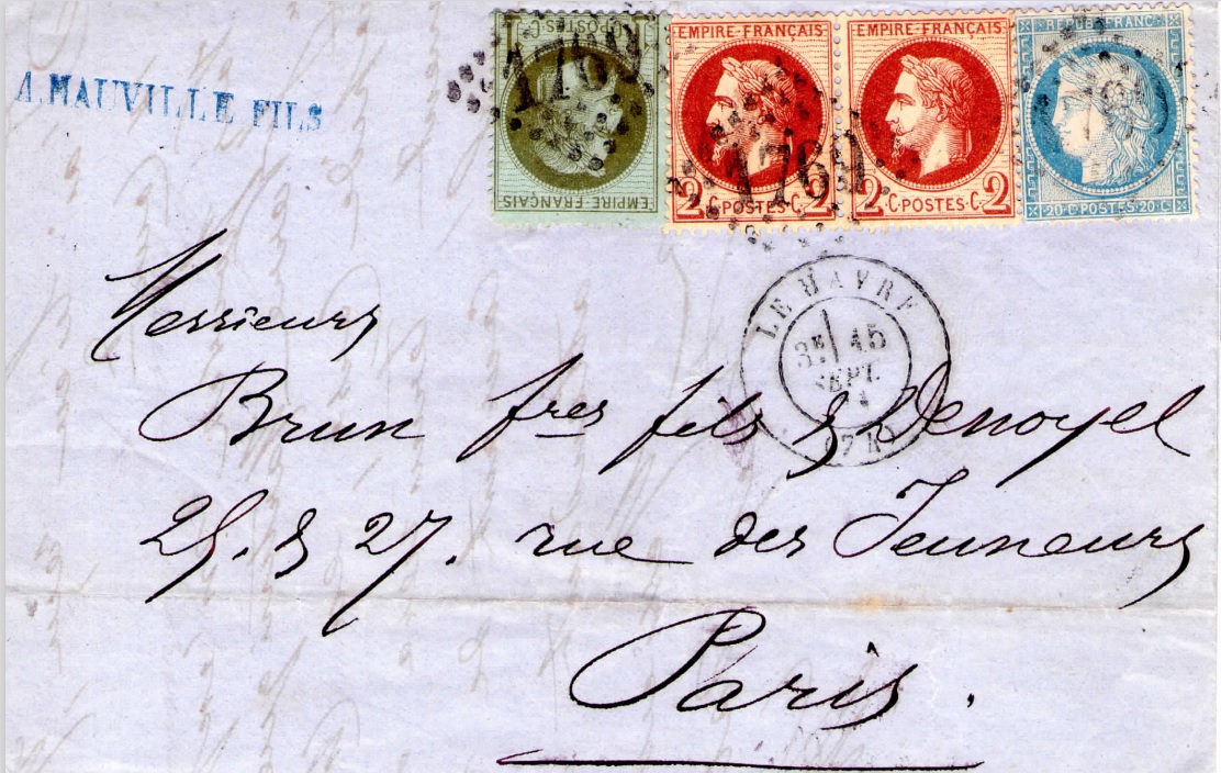 Je suis en possession d’un courrier avec correspondance datée du 15/09/1871 du Havre à Paris : Affranchissement composé du n° 37 (20 cts Cérès dite du siège de Paris) ainsi que des n° 25 et d’une paire de n° 26B (1ct et 2cts Napoléon III lauré) en complément d’affranchissement. Oblitération losange GC 1769.