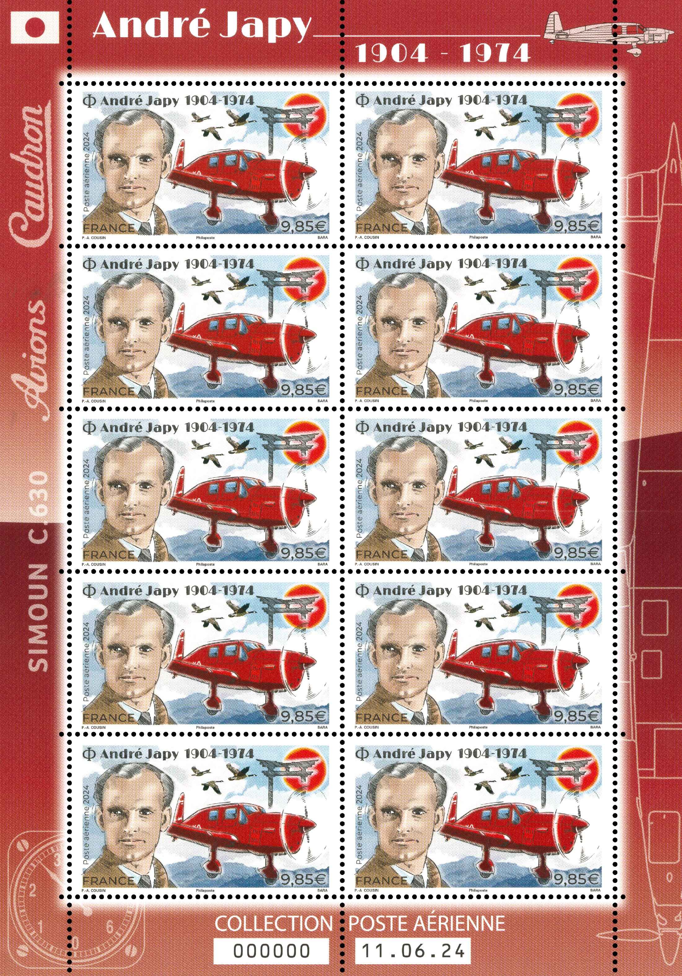 La Poste émet un timbre et 2 mini-feuilles de la série Poste aérienne à l’effigie d’André Japy à l’occasion du 120ème anniversaire de sa naissance et du 50ème anniversaire de sa disparition.