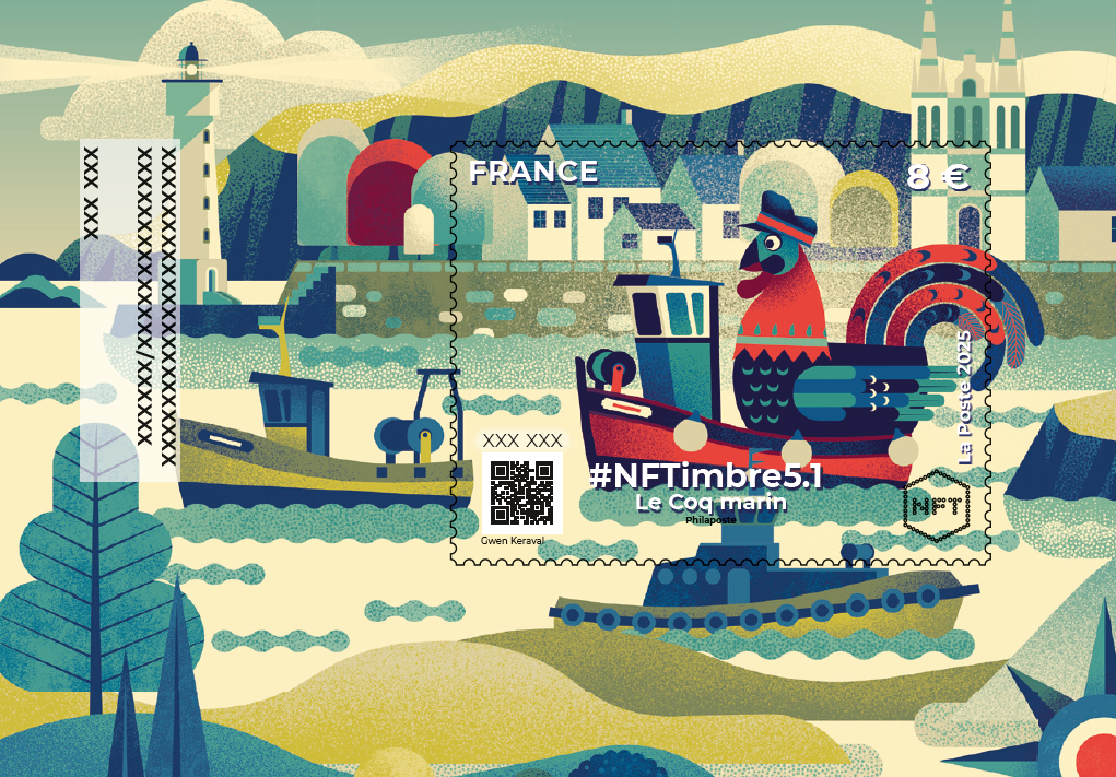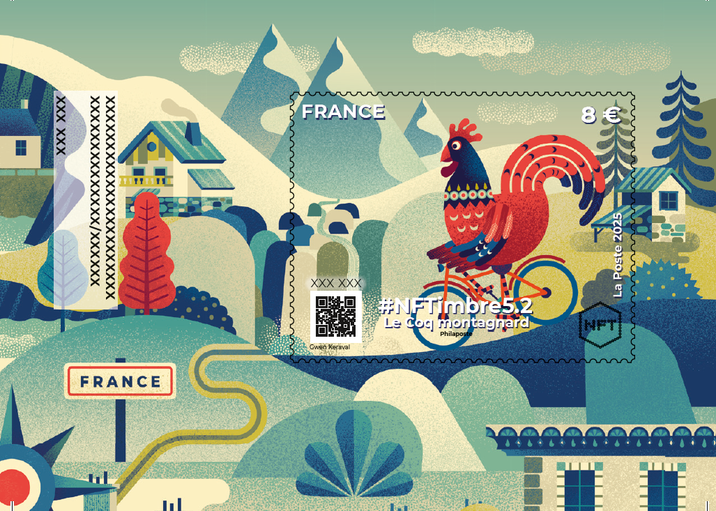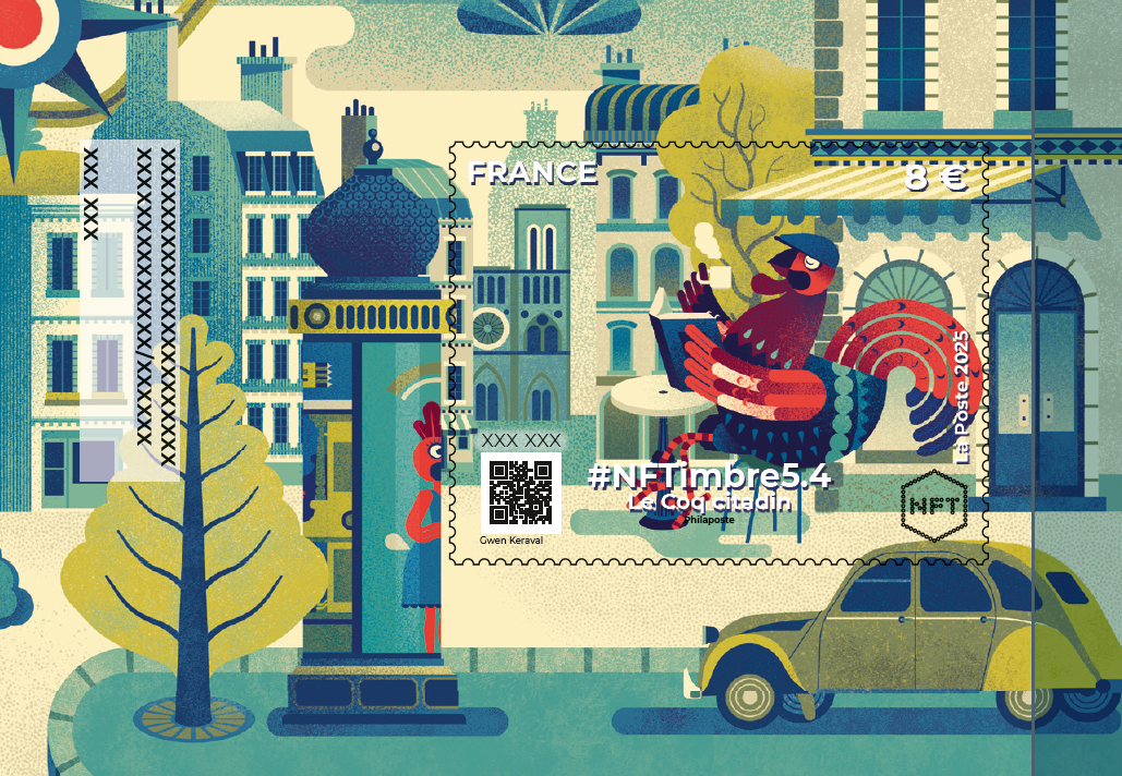 La Poste lance une nouvelle série #NFTimbre5 - Coqs français - confiée à l’illustrateur Gwen Keraval, qui met à l’honneur une interprétation à la fois symbolique et décalée du coq français, figure emblématique du patrimoine national.