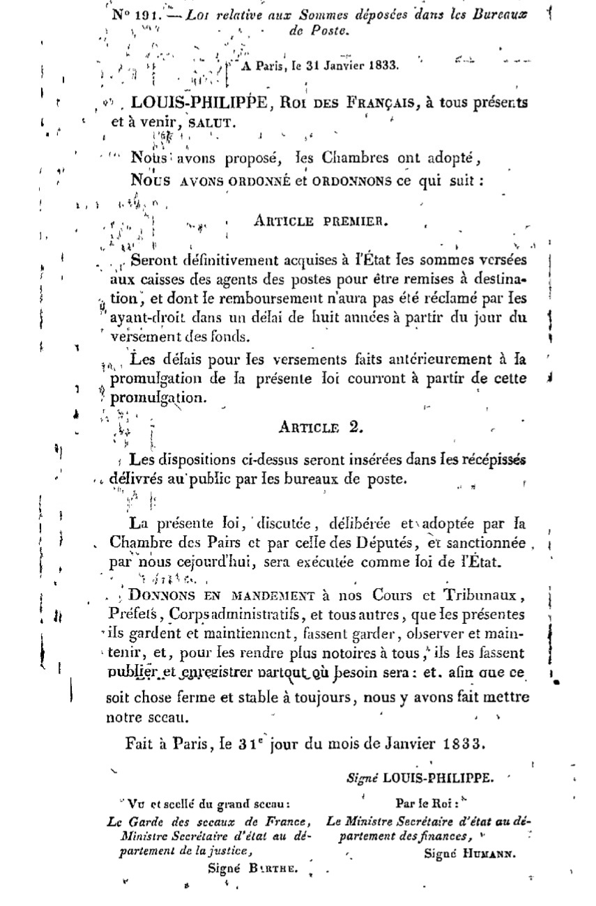 Ordonnance N° 191 du 31/01/1833 Scan d’un texte officiel publié au Bulletin Officiel des Lois.