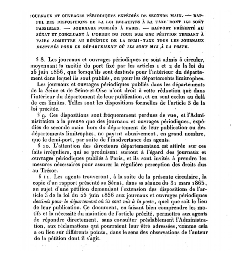 "Journaux et ouvrages périodiques expédiés de seconde main — Rappel des dispositions de la loi relatives à la taxe dont ils sont passibles - Journaux publiés à Paris."