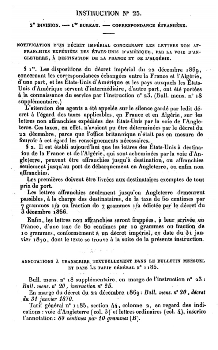 "Notification d’un Décret impérial concernant les lettres non affanchies expédiées des États-Unis d’Amérique, par la voie d’Angleterre, à destination de la France et de l’Algérie."