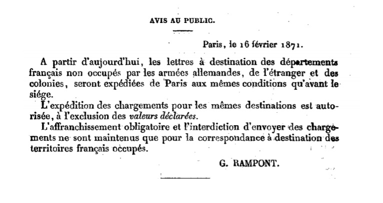 Notification du 16/02/1871 Scan de la reproduction officielle d’un texte officiel