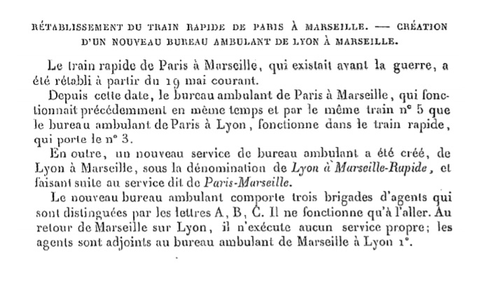 "Rétablissement du train rapide de Paris à Marseille - Création d’un nouveau ambulant de Lyon à Marseille."