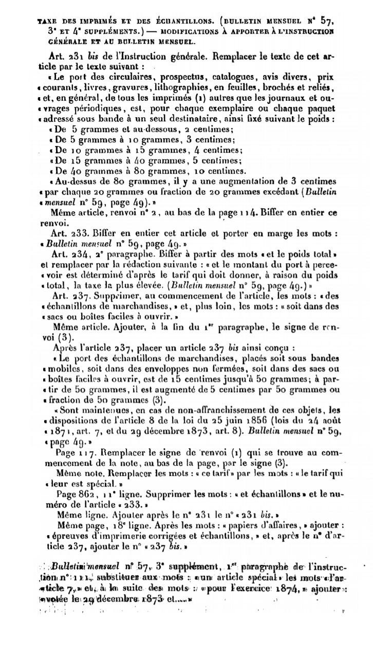 "Taxe des imprimés et des échantillons (bulletin mensuel N° 57, 3° et 4° suppléments) - Modifications à apporter à l’instruction générale et au bulletin mensuel."