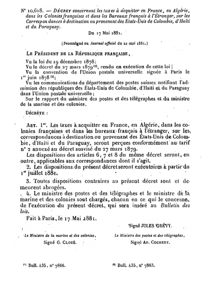 "DÉCRET concernant les taxes à acquitter en France, en Algérie, dans les Colonies françaises et dans les Bureaux français à l’Étranger, sur les Correspondances à destination ou provenant des États-Unis de Colombie, d’Haïti et du Paraguay."