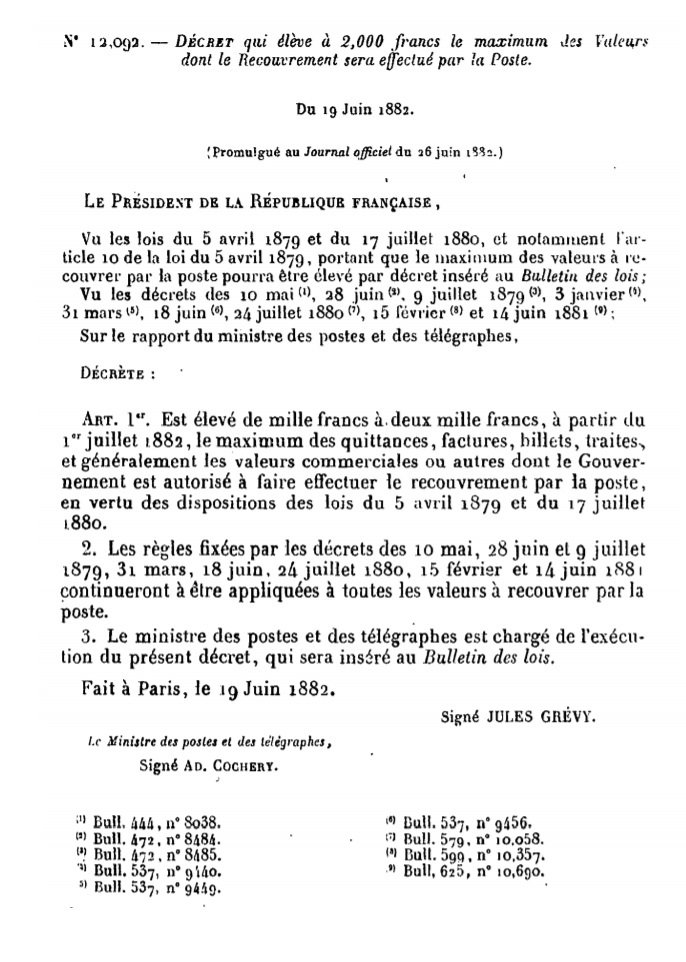 Décret N° 12092 du 19/06/1882 Scan d’un texte officiel publié au Bulletin Officiel des Lois.