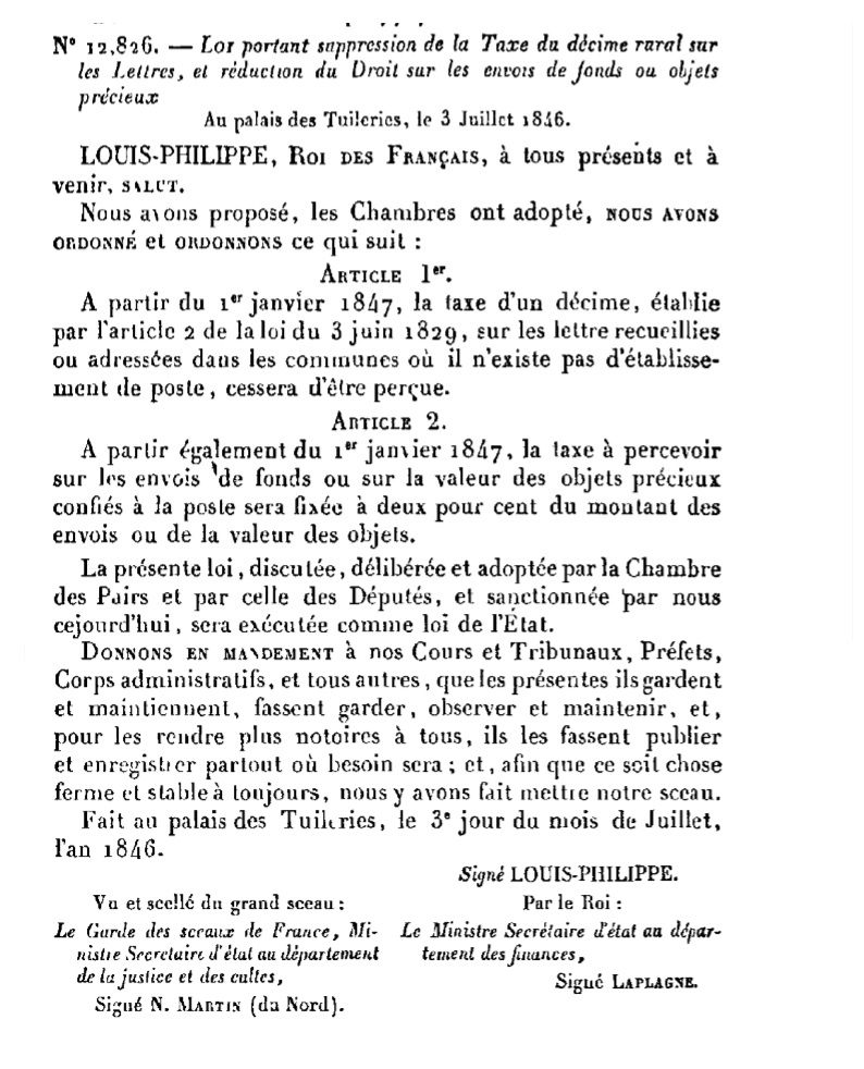 Loi N° 12826 du 03/07/1846 Scan d’un texte officiel publié au Bulletin Officiel des Lois.