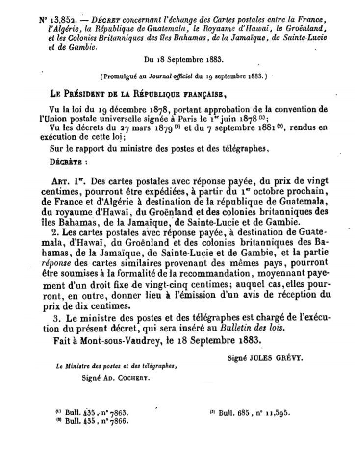 "DÉCRET concernant l’échange des Cartes postales entre la France, l’Algérie, la République de Guatemala, le Royaume d’Hawaï, le Groënland, et les Colonies Britanniques des îles Bahamas, de la Jamaïque, de Sainte-Lucie et de Gambie."