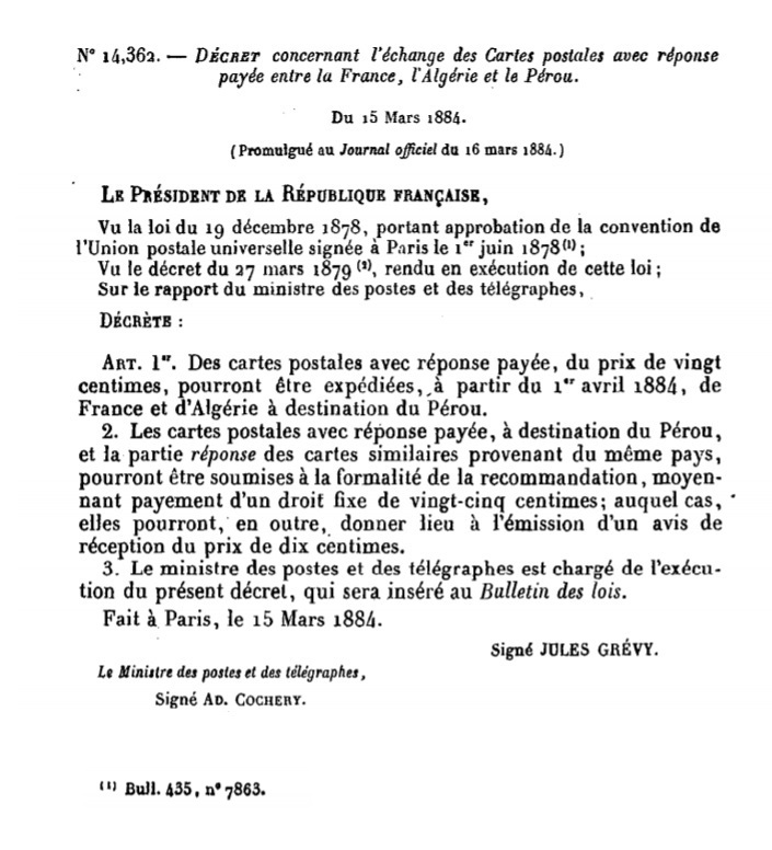 Décret N° 14362 du 15/03/1884 Scan d’un texte officiel publié au Bulletin Officiel des Lois.
