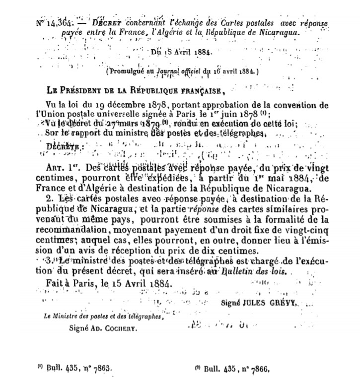 Décret N° 14364 du 15/04/1884 Scan d’un texte officiel publié au Bulletin Officiel des Lois.