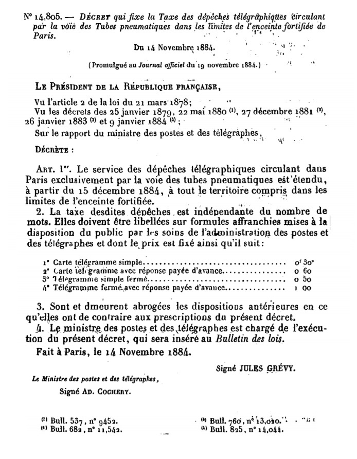 Décret N° 14805 du 14/11/1884 Scan d’un texte officiel publié au Bulletin Officiel des Lois.