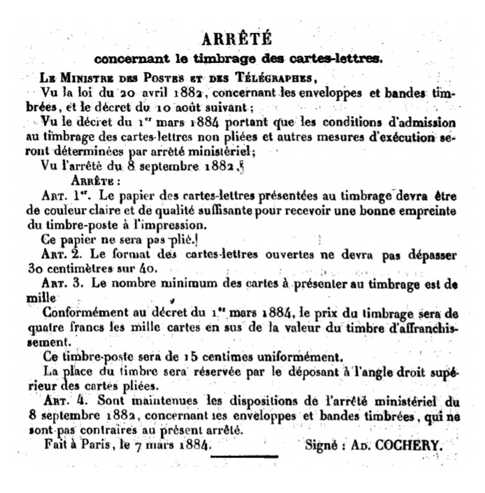 Arrêté du 07/03/1884 Scan d’un document officiel publié au Bulletin mensuel des Postes et Télégraphes.