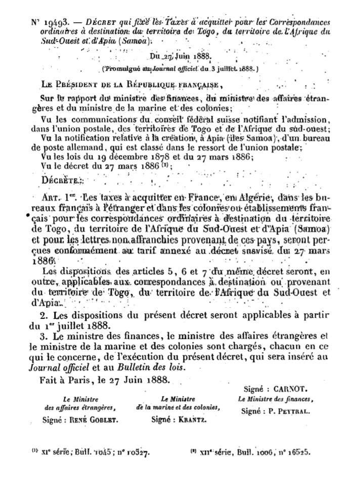 "DÉCRET qui fixe les Taxes à acquitter pour les Correspondances ordinaires à destination du territoire de Togo, du territoire de l’Afrique du Sud-Ouest et d’Apia (Samoa)."