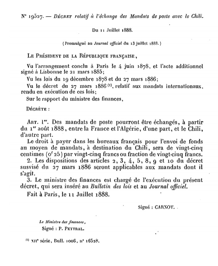 Décret N° 19527 du 11/07/1888 Scan d’un texte officiel publié au Bulletin Officiel des Lois.