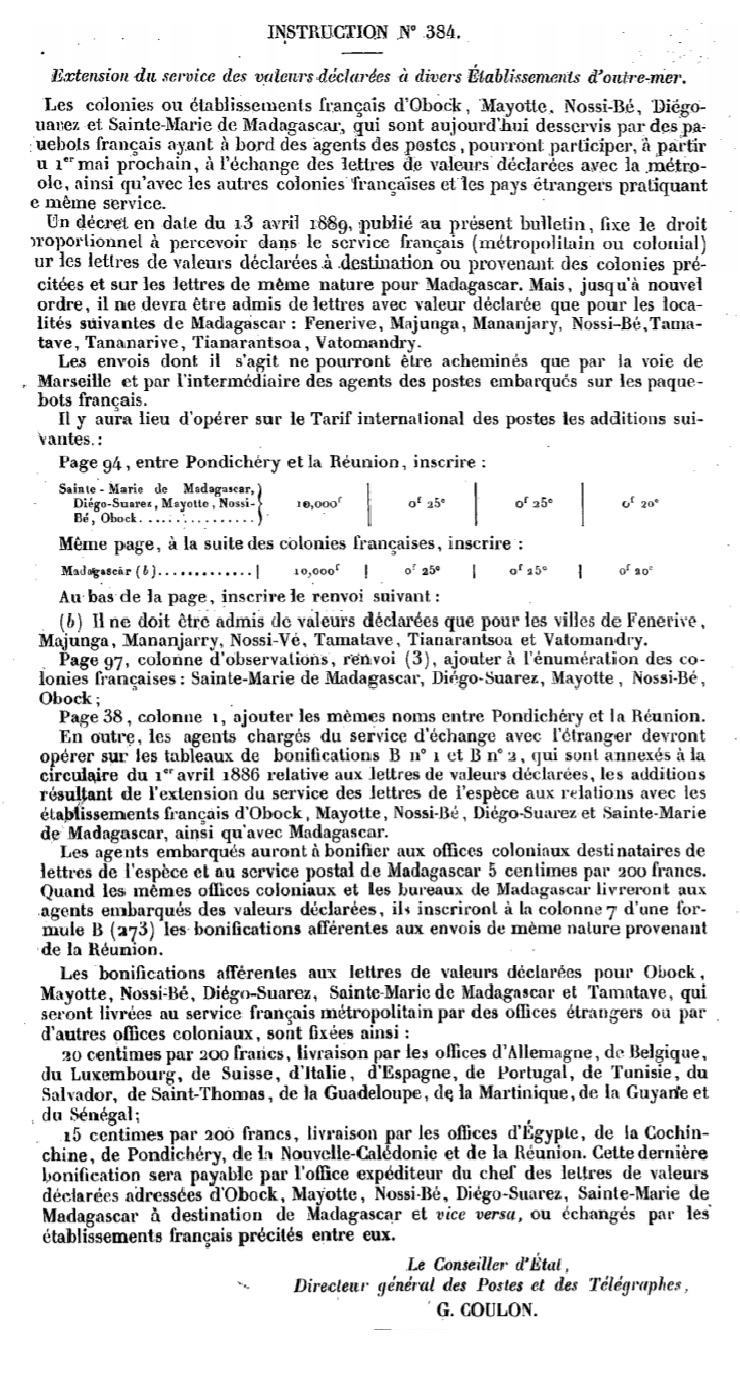 Instruction N° 384 d’avril 1889 Scan d’un document officiel publié au Bulletin mensuel des Postes et Télégraphes.