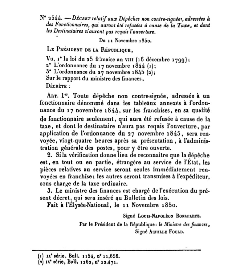 Décret N° 2544 du 11/11/1850