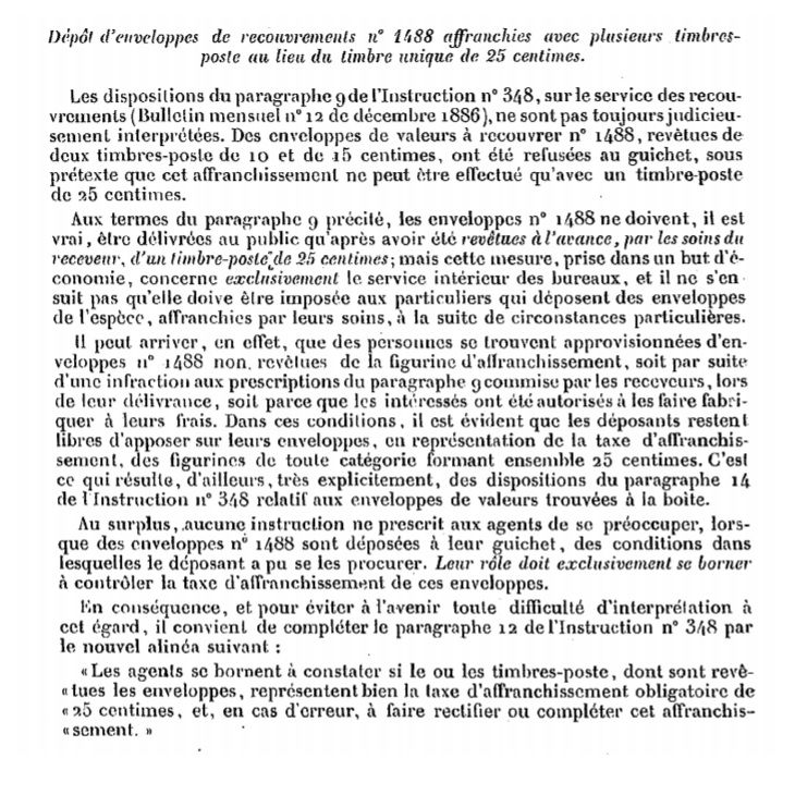 "Dépôt d’enveloppes de recouvrements n° 1688 affranchies avec plusieurs timbres-poste au lieu du timbre unique de 25 centimes."