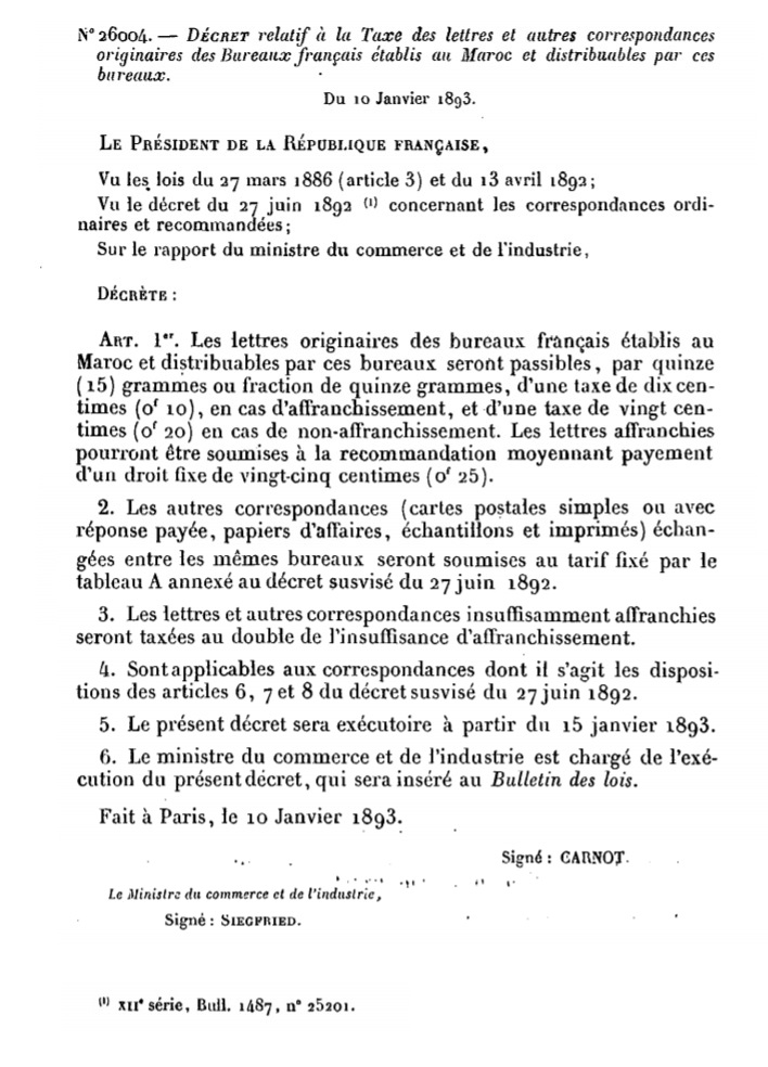 Décret N° 26004 du 10/01/1893 Scan d’un texte officiel publié au Bulletin Officiel des Lois.