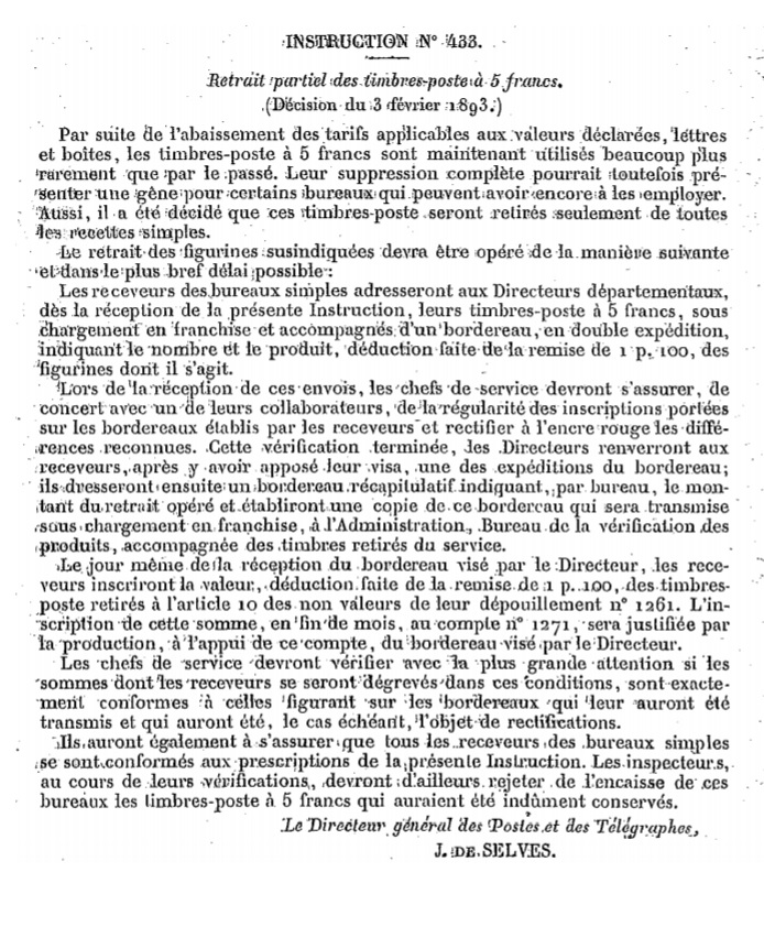 Instruction N° 433 de février 1893 Scan d’un document officiel publié au Bulletin mensuel des Postes et Télégraphes.