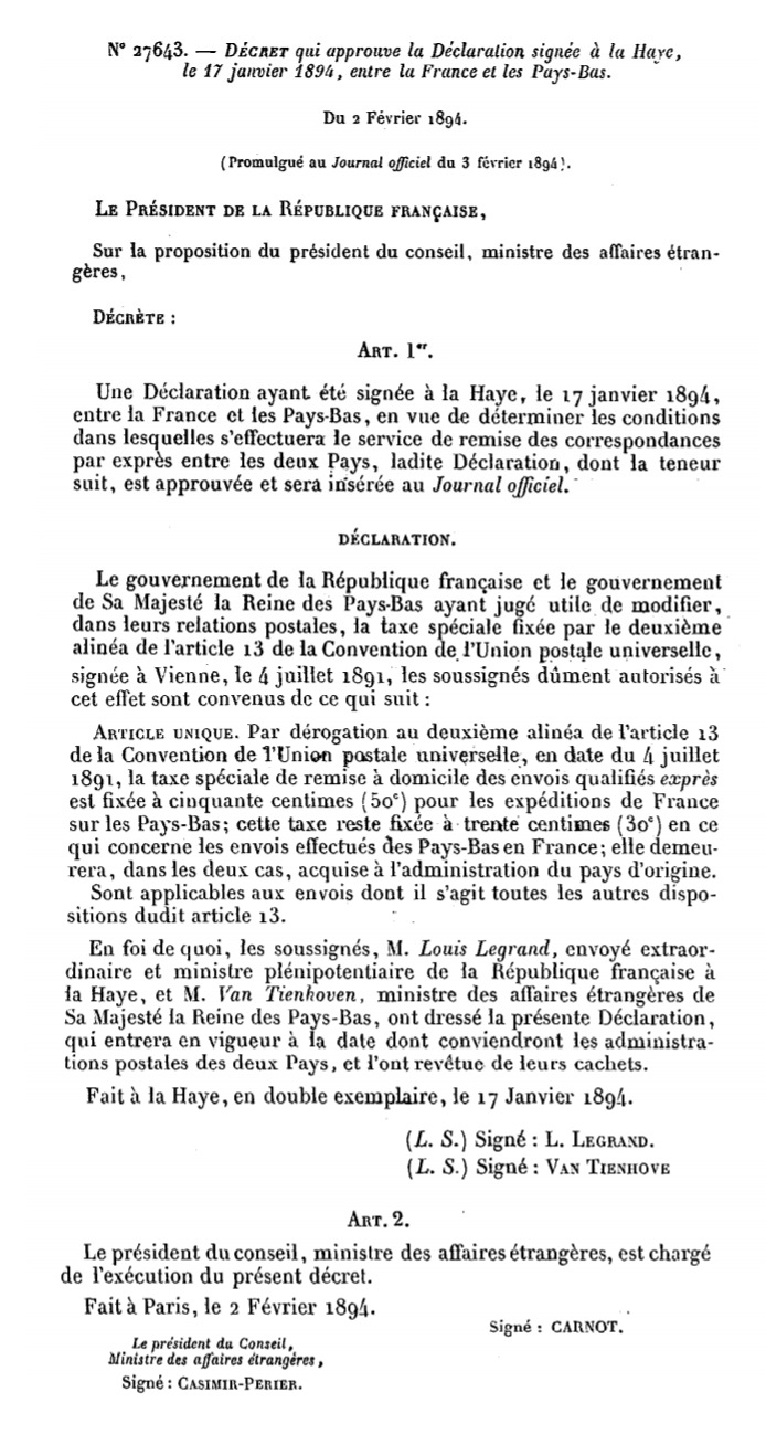 Décret N° 27643 du 02/02/1894 Scan d’un texte officiel publié au Bulletin Officiel des Lois.
