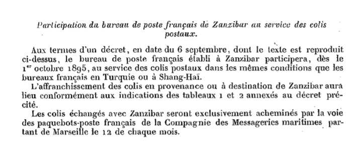 "Participation du bureau de poste français de Zanzibar au service des colis postaux."
