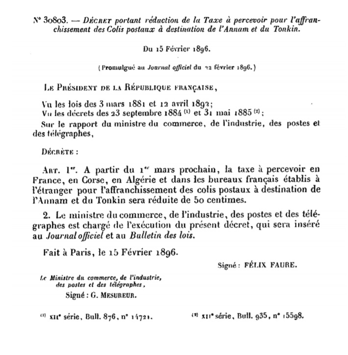 Décret N° 30803 du 15/02/1896 Scan d’un texte officiel publié au Bulletin Officiel des Lois.