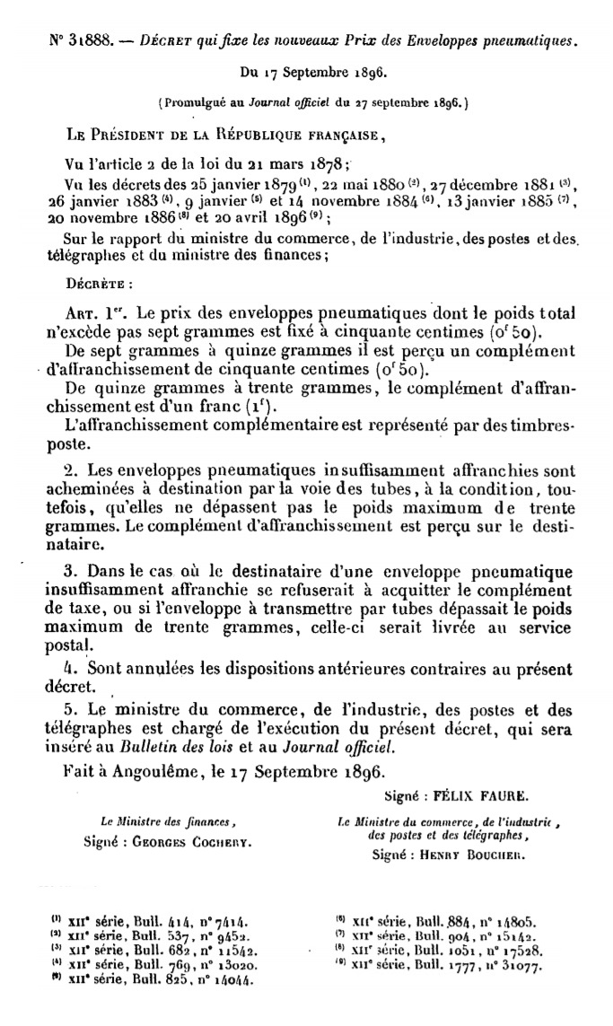 Décret N° 31888 du 17/09/1896 Scan d’un texte officiel publié au Bulletin Officiel des Lois.