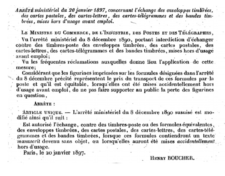 "ARRÊTÉ ministériel du 20 janvier 1897, concernant l’échange des enveloppes timbrées, des cartes postales, des cartes-lettres, des cartes-télégrammes et des bandes timbrées, mises hors d’usage avant emploi."
