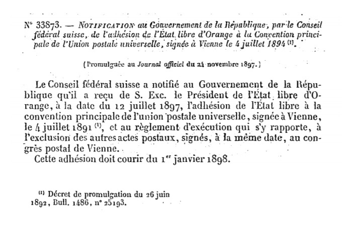 "NOTIFICATION au Gouvernement de la République, par le Conseil fédéral suisse, de l’adhésion de l’Etat libre d’Orange à la Convention principale de l’Union postale universelle, signée à Vienne le 4 juillet 1894 (1)"
