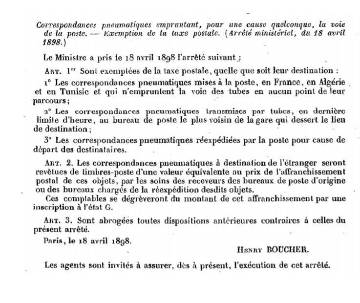 "Correspondances pneumatiques empruntant, pour une cause quelconque, la voie de la poste — Exemption de la taxe postale. (Arrêté ministériel, du 18 avril 1898.)"
