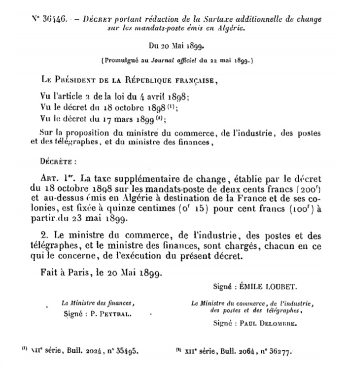 Décret N° 36446 du 20/05/1899 Scan d’un texte officiel publié au Bulletin Officiel des Lois.