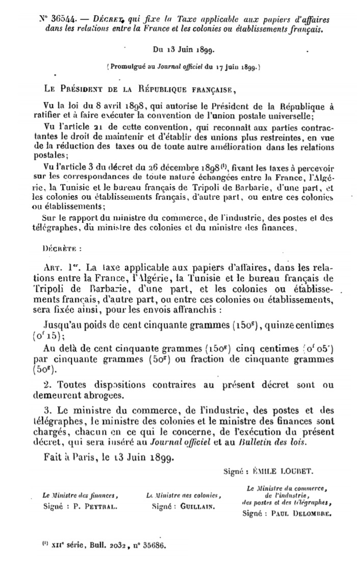 Décret N° 36544 du 13/06/1899 Scan d’un texte officiel publié au Bulletin Officiel des Lois.