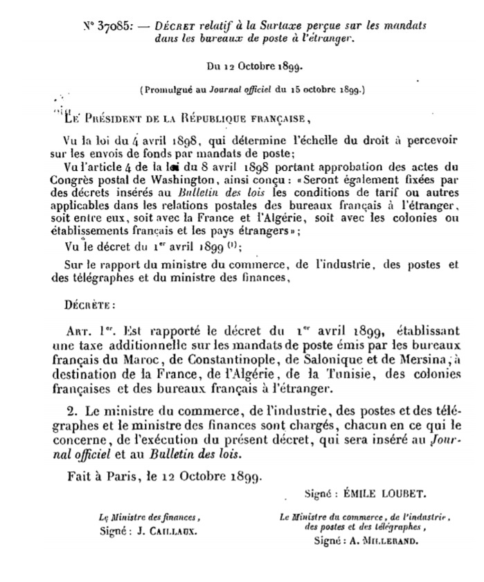 Décret N° 37085 du 12/10/1899 Scan d’un texte officiel publié au Bulletin Officiel des Lois.