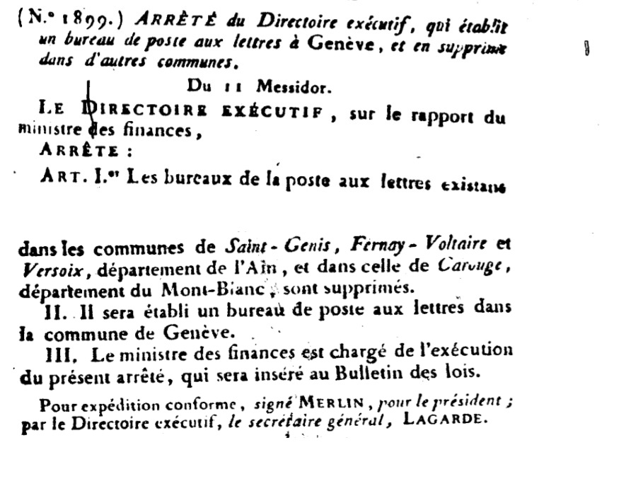 Arrêté N° 1899 du 29/06/1798 Scan d’un texte officiel publié au Bulletin Officiel des Lois.
