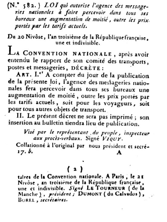 "LOI qui autorise l’agence des messageries nationales à faire percevoir dans tous ses bureaux une augmentation de moitié, outre les prix portés par les tarifs actuels"