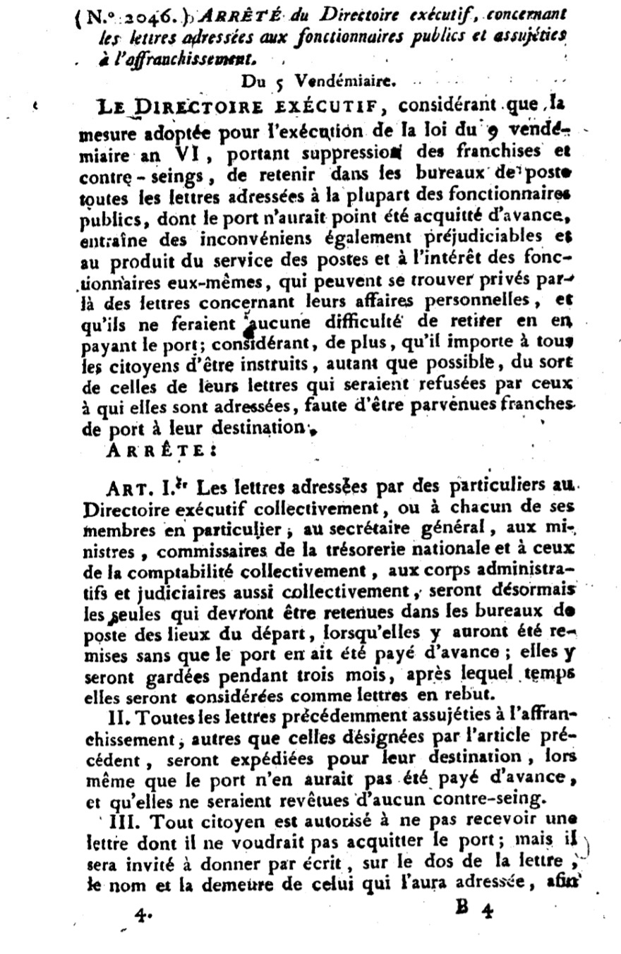 Arrêté N° 2046 du 12/09/1798 Scan d’un texte officiel publié au Bulletin Officiel des Lois.