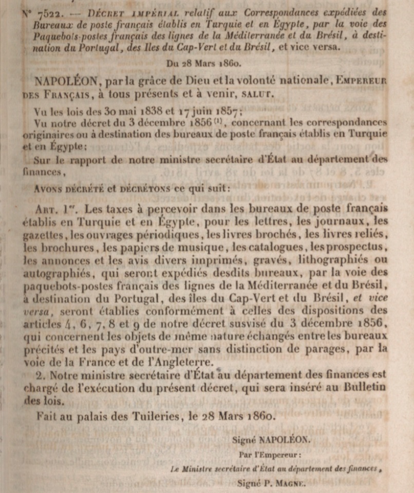 "DÉCRET IMPÉRIAL relatif aux Correspondances expédiées des Bureaux de poste français établis en Turquie et en Egypte, par la voie des Paquebots-postes français des lignes de la Méditerranée et du Brésil, à destination du Portugal, les Iles du Cap-Vert et le"