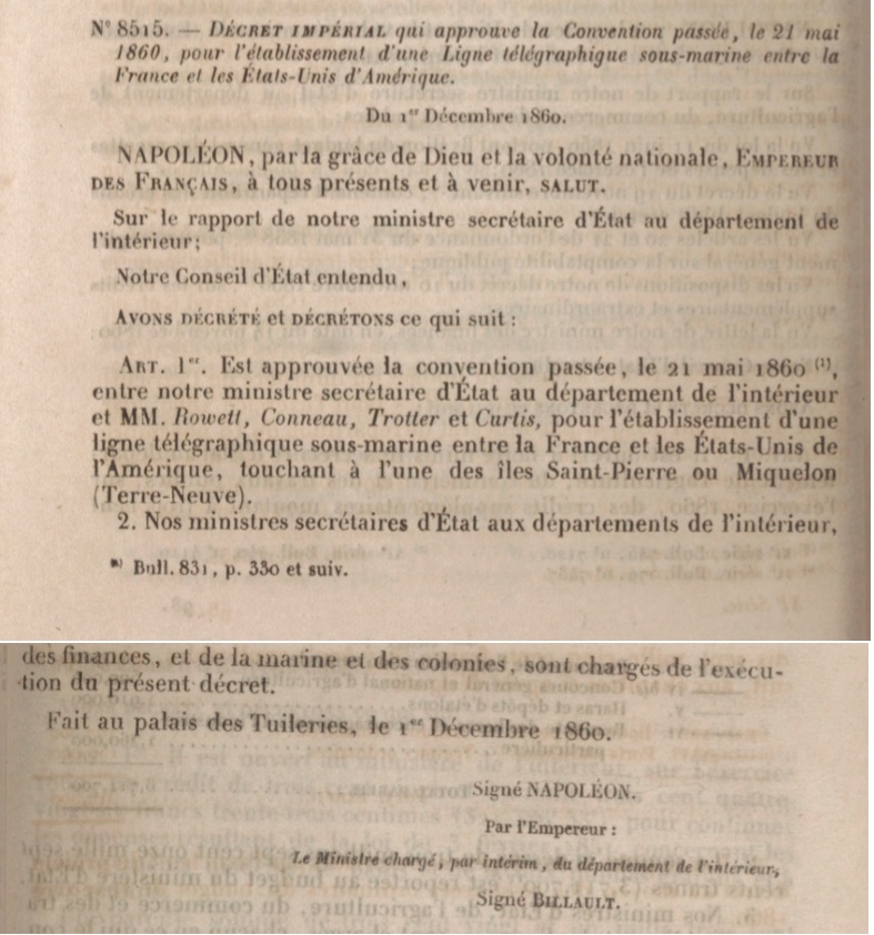 "DÉCRET IMPÉRIAL qui approuve la Convention passée, le 21 mai 1860, pour l’établissement d’une Ligne télégraphique sous-marine entre la France et les États-Unis d’Amérique."