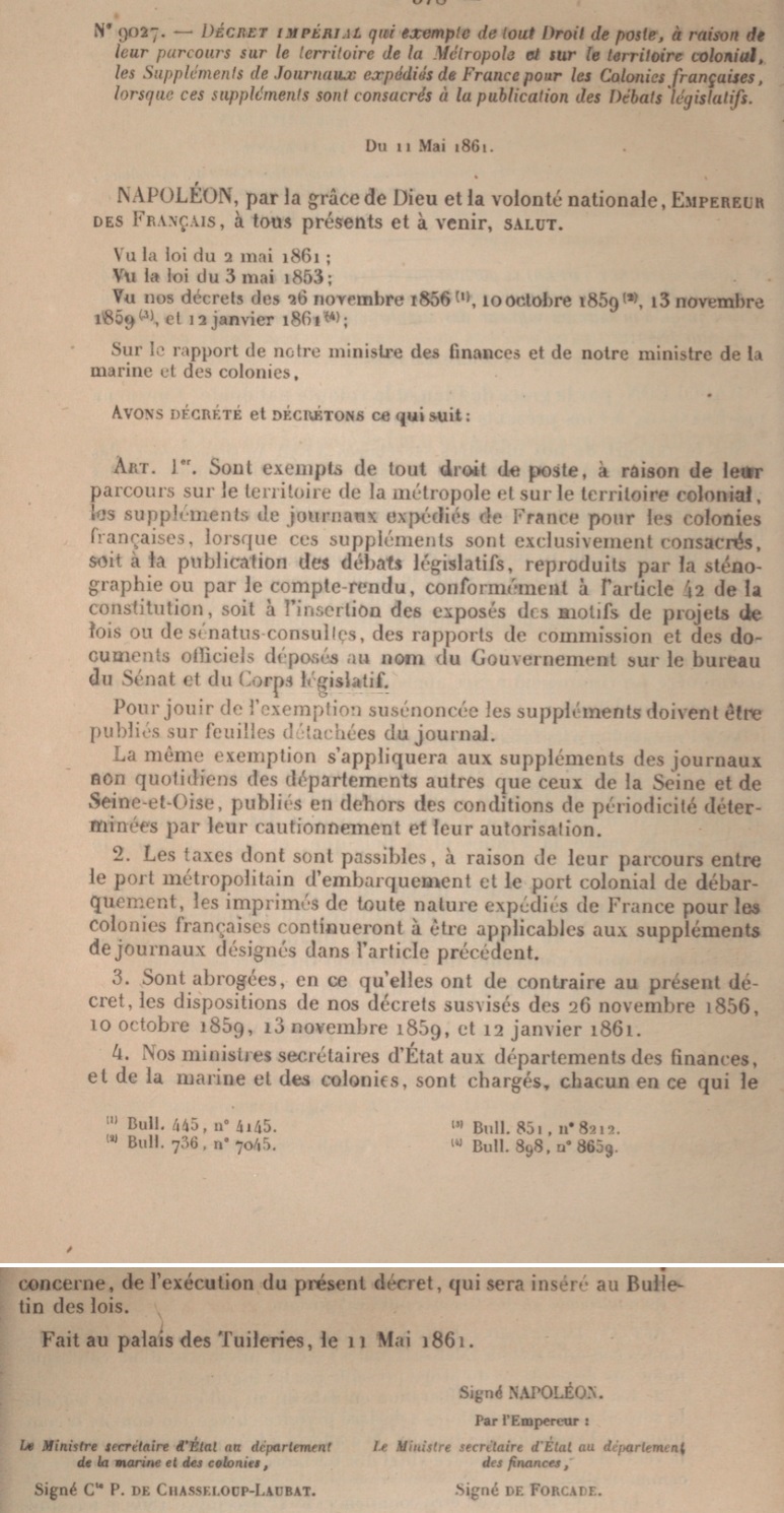 "DÉCRET IMPÉRIAL qui exempte de tout Droit de poste, à raison de leur parcours sur le territoire de la Métropole et sur le territoire colonial, les Suppléments de Journaux expédiés de France pour les Colonies françaises lorsque ces suppléments sont consacré"