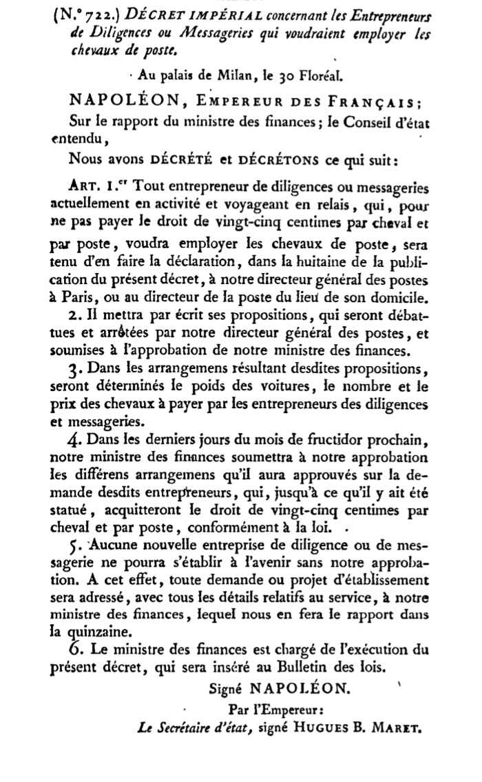 Décret N° 722 du 20/05/1805 Scan d’un texte officiel publié au Bulletin Officiel des Lois.