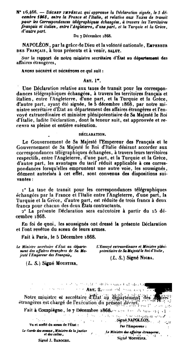 "DÉCRET IMPÉRIAL qui approuve la Déclaration signée, le 5 décembre 1868, entre la France et l’Italie, et relative aux Taxes de transit pour les Correspondances télégraphiques échangées, à travers les Territoires français et italien, entre l’Angleterre, d’un"