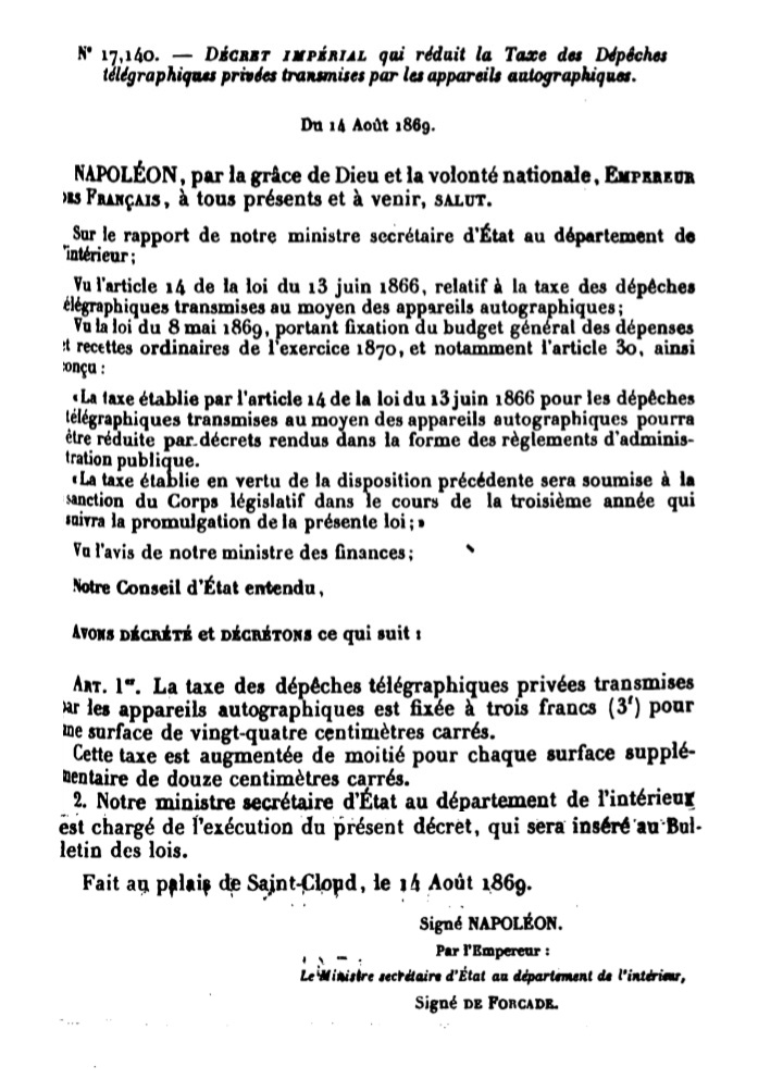 Décret N° 17140 du 14/08/1869 Scan d’un texte officiel publié au Bulletin Officiel des Lois.