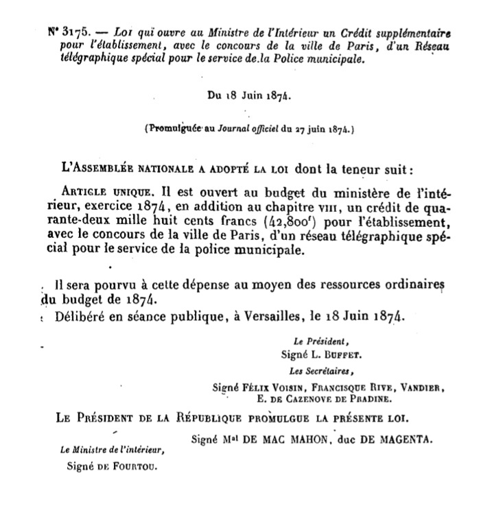 "LOI qui ouvre au Ministère de l’Intérieur un Crédit supplémentaire pour l’établissement, avec le concours de la ville de Paris, d’un Réseau télégraphique spécial pour le service de la Police municipale."