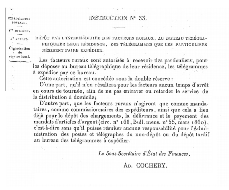 "Dépôt par l’intermédiaire des facteurs ruraux, au bureau télégraphique de leur résidence, des télégrammes que les particuliers désirent faire expédier."