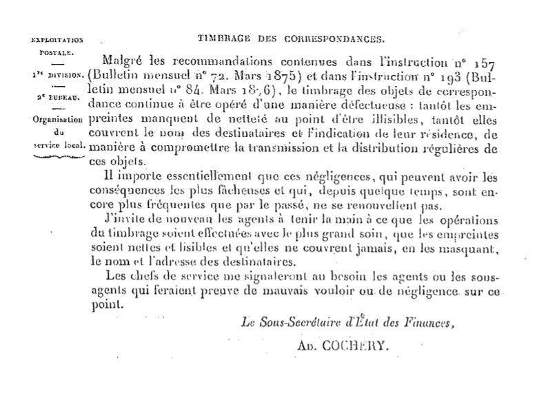 Circulaire de juillet 1878 Scan d’un document officiel publié au Bulletin mensuel des Postes et Télégraphes.