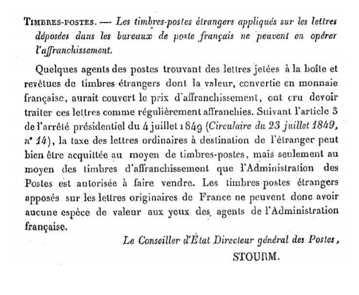 "TIMBRES-POSTES.— Les timbres-postes étrangers appliqués sur les lettres déposées dans les bureaux de poste français ne peuvent en opérer l’affranchissement."