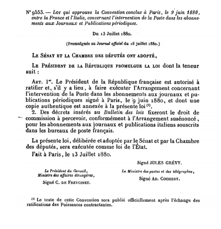 "LOI qui approuve la Convention conclue, le 9 juin 1880, entre la France et l’Italie, concernant l’Intervention de la Poste dans les abonnements aux Journaux et Publications périodiques."