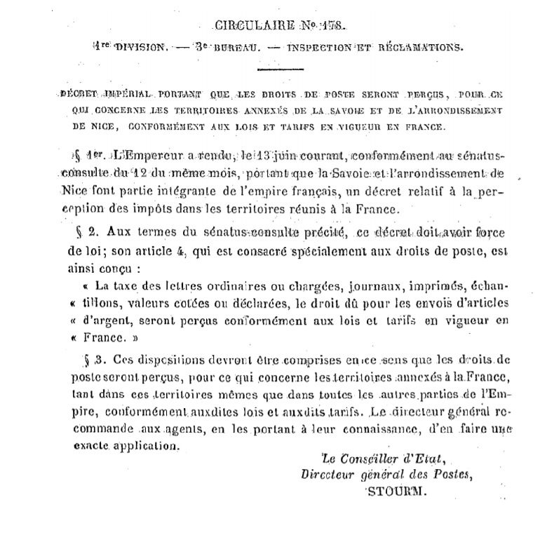 "Décret impérial portant que les droits de poste seront perçus, pour ce qui concerne les territoires annexés de la Savoie et de l’arrondissement de Nice, conformément aux lois et tarifs en vigueur en France."